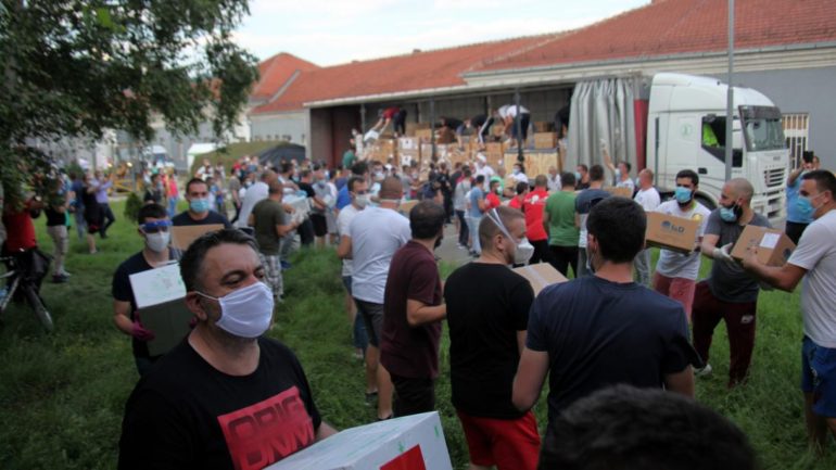 Riječ je o šleperu sa hirurškim maskama, higijenskim sredstvima, medicinskim i drugim aparatima i mašinama koji su dostavljeni u privremenu COVID-19 bolnicu u Novom Pazaru. Podsjećamo da je grad Novi Pazar apelovao na građane da se okupe i pomognu u istovaru šlepera, što govori o količini pomoći koji je stigla u ovaj grad.