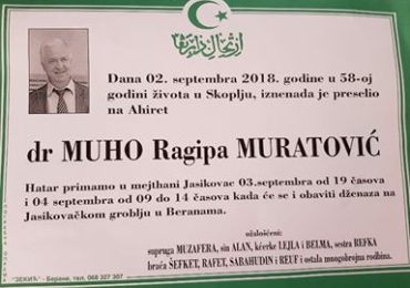 U Beranama, u 58-oj godini života, iznenada je preminuo dr Muho Ragipov Muratović, specijalista urgentne medicine – remuatolog. Komemorativna sjednica je održana u amfiteatru Doma zdravlja u Berana…