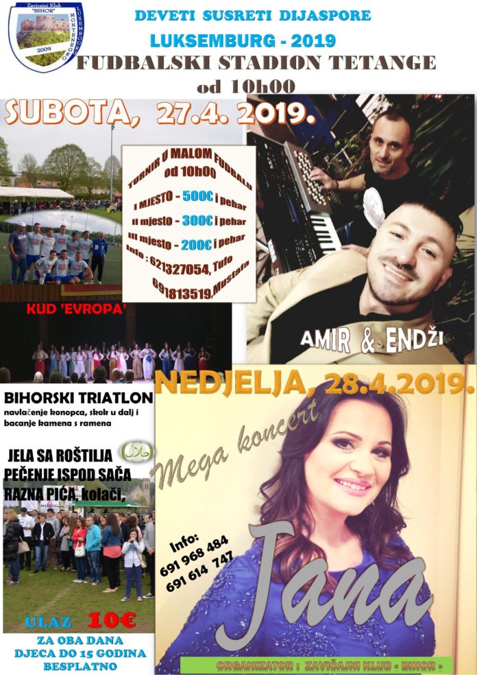 Zavičajni klub “Bihor” iz Luksemburga organizuje tradicionalne “Devete susrete dijaspore” u subotu i nedjelju, 27 i 28. aprila 2019. godine. Susreti ce se održati na fudbalskom stadionu u TETANGE, adresa : rue Thomas Byrne L-3761 TETANGE.