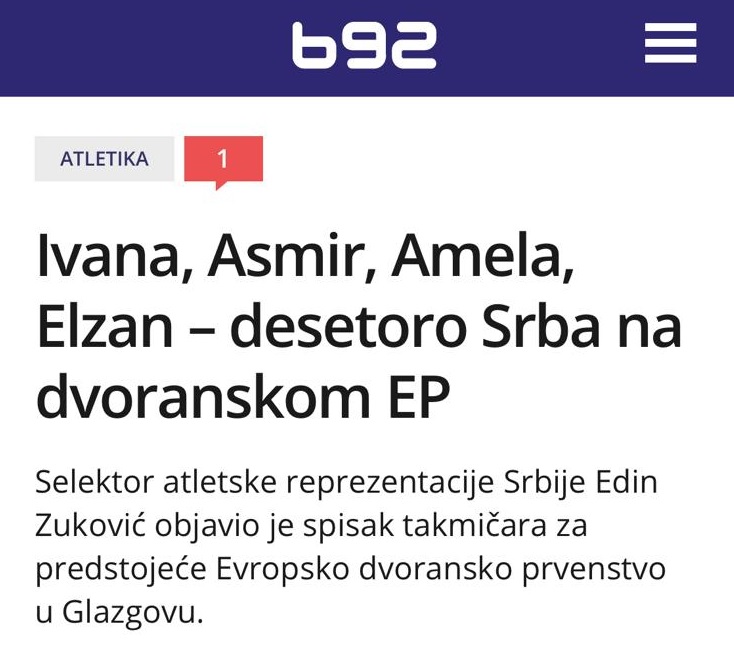 Mediji u Srbiji nastavljaju sa asimilacijom sportista bošnjačke nacionalnosti predstavljajući ih kao Srbe. Ova praksa prisutna je godinama unazad, pa je tako danas je portal b92.net objavio tekst pod naslovom “Ivana, Asmir, Amela, Elzan – desetoro Srba na dvoranskom EP”.