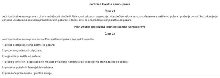 Član 22) Jedinica lokalne samouprave donosi Plan zaštite od požara koji sadrži naročito: